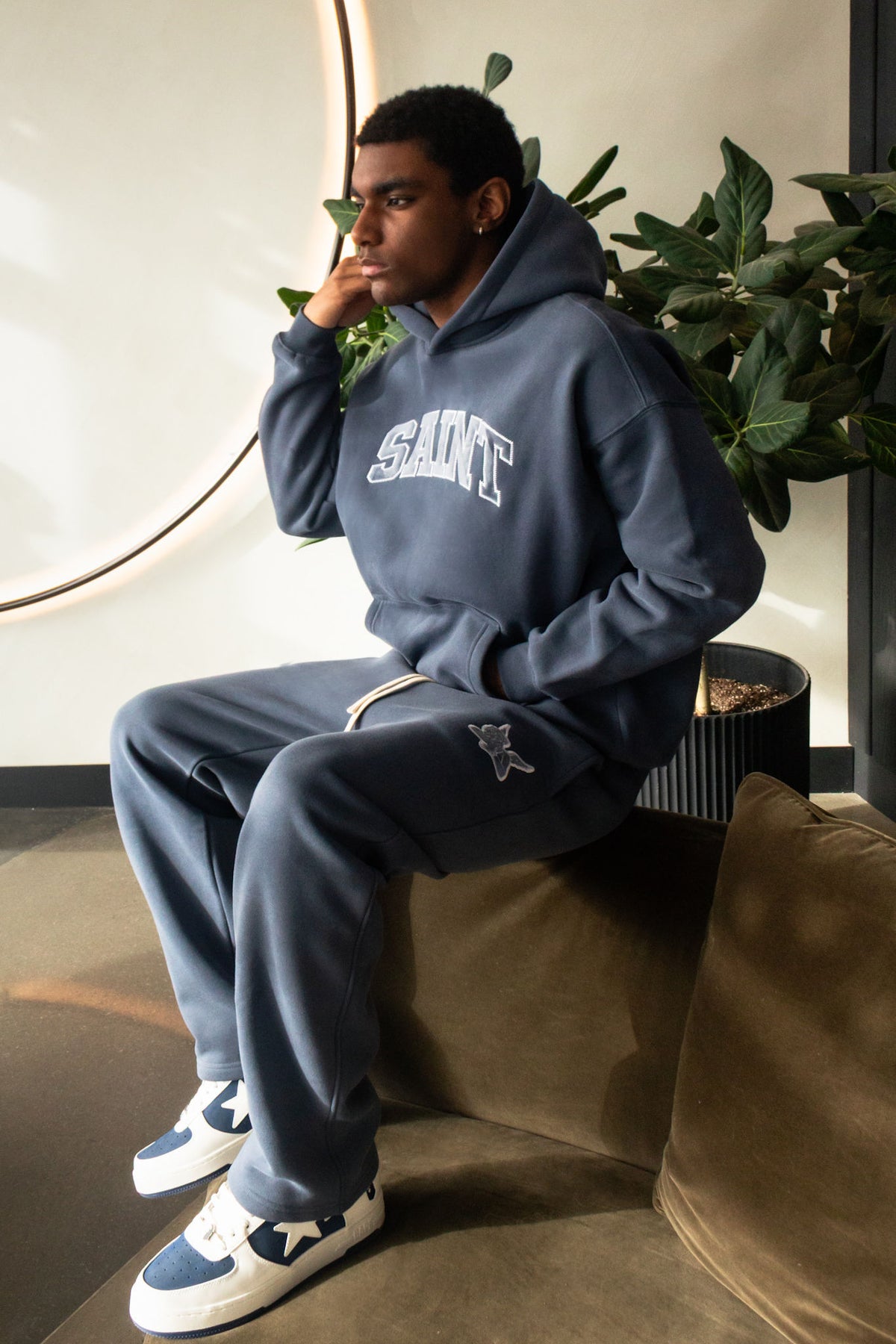 A relaxed straight-leg jogger in a muted dusty blue, finished with textured corduroy Saint applique detailing. Aegean carries a soft, vintage feel with subtle depth, offering a refined take on everyday comfort.